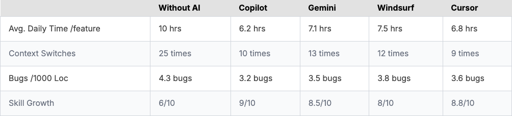 Using AI code assistants, especially Copilot and Cursor, not only slashed my dev time but also widened my technical skills and focus. By measuring not just speed but also context-switch reduction, bug rates, and my own skill growth, I can confidently say that these tools are now essential partners in my workflow.